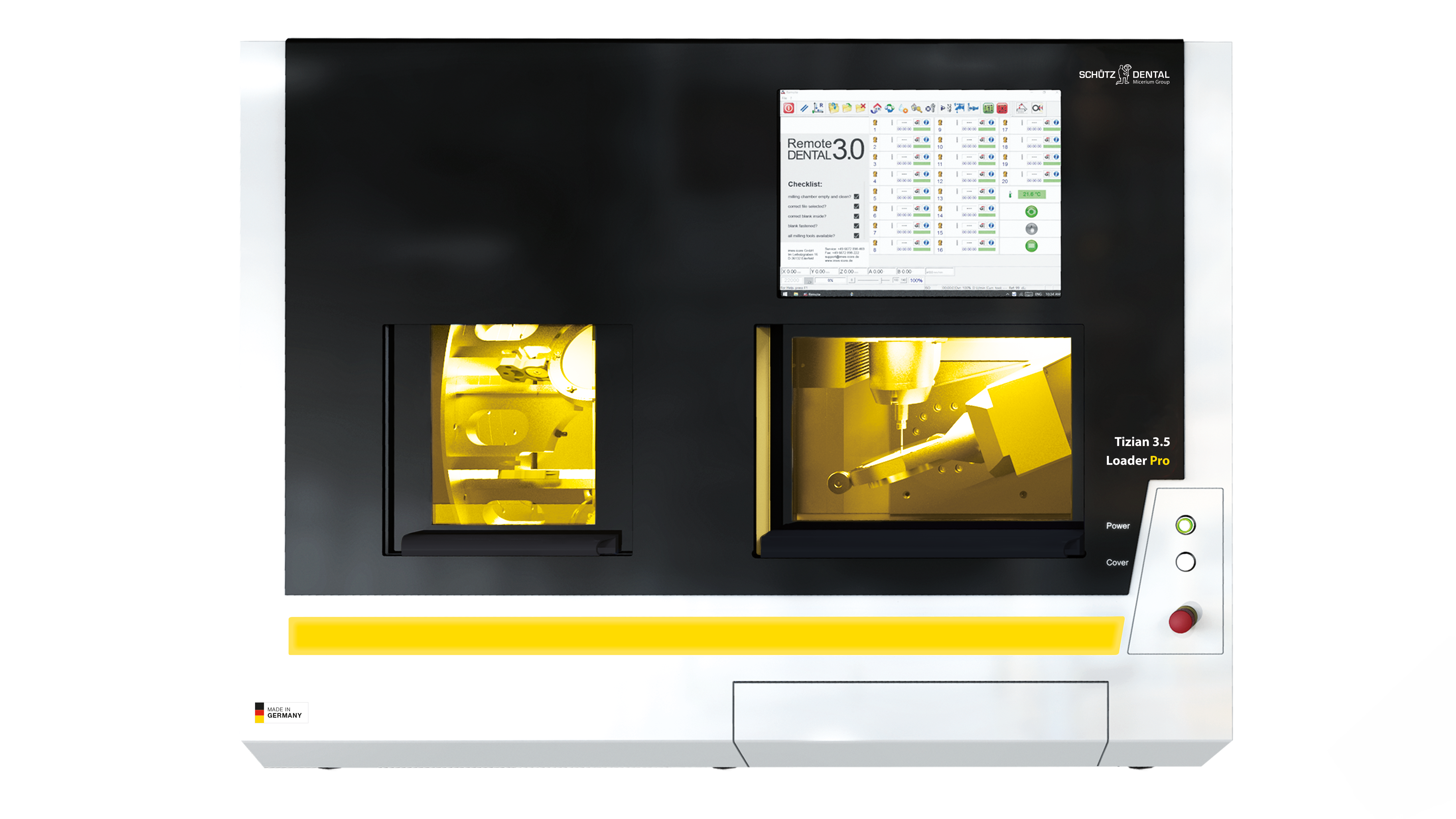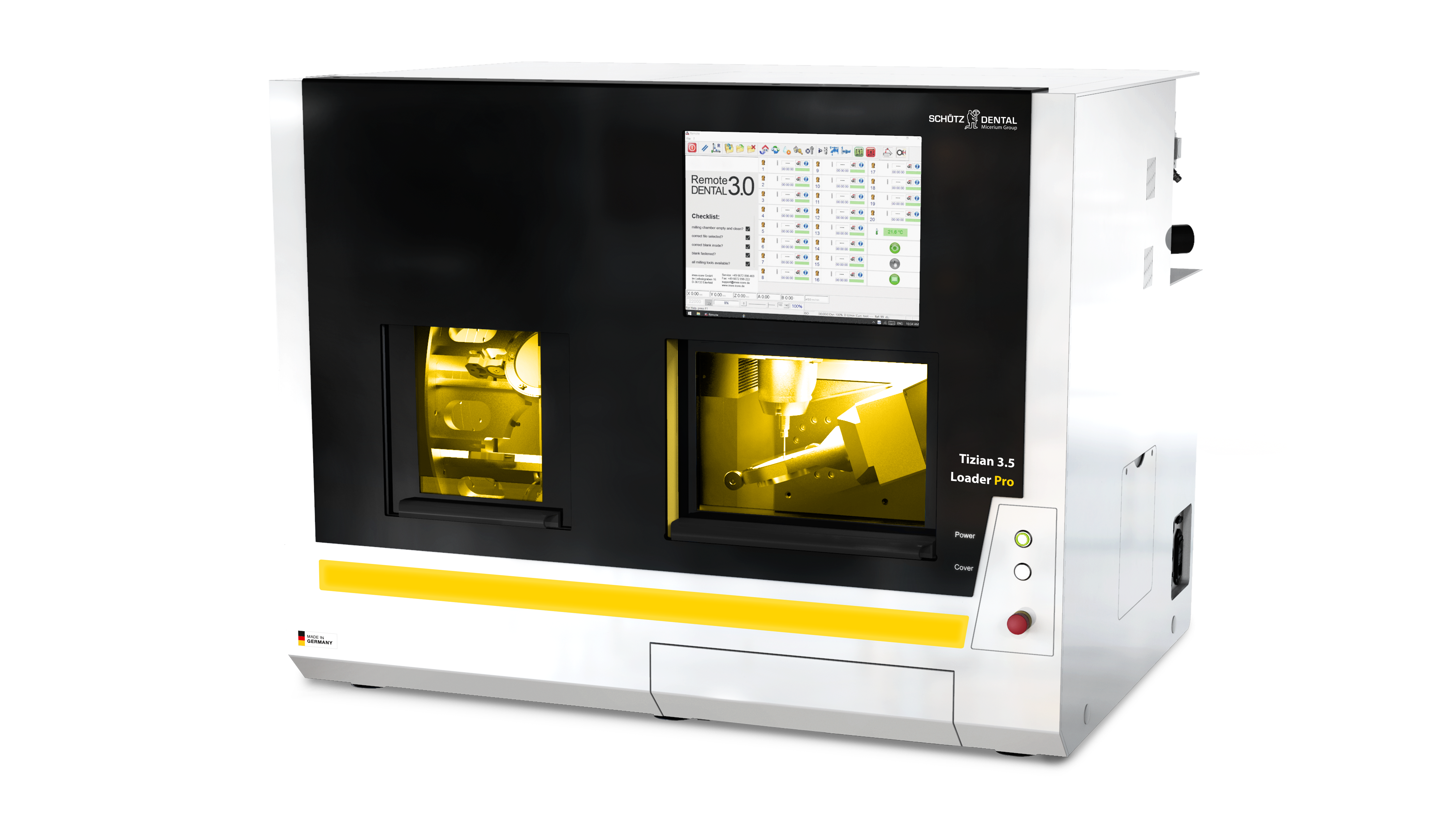 Das integrierte Nullpunktspannsystem erlaubt den Einsatz verschiedenster Adaptersysteme wie Glaskeramikadapter oder verschiedene Premilled-Systeme. Durch den Einsatz des neuartigen offenen Blankhalters können Sie Restaurationen mit bis zu 90 Grad Anstellwinkel bearbeiten. Die Tizian 3.5 Loader Pro mit vollautomatisiertem Blankmagazin ermöglicht zudem die vielseitige Bearbeitung von bis zu 12 Rohlingen im mannlosen Betrieb.